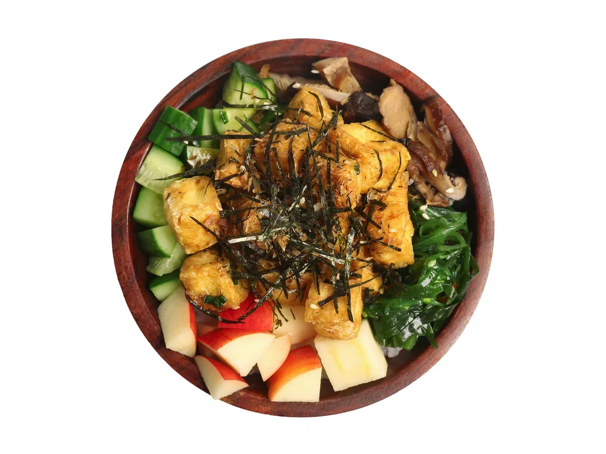 Рис, жаренный тофу с заправкой на основе кунжутного масла, огурец, грибы шиитаке, чука, яблоко, ореховый соус, фурикаке*.